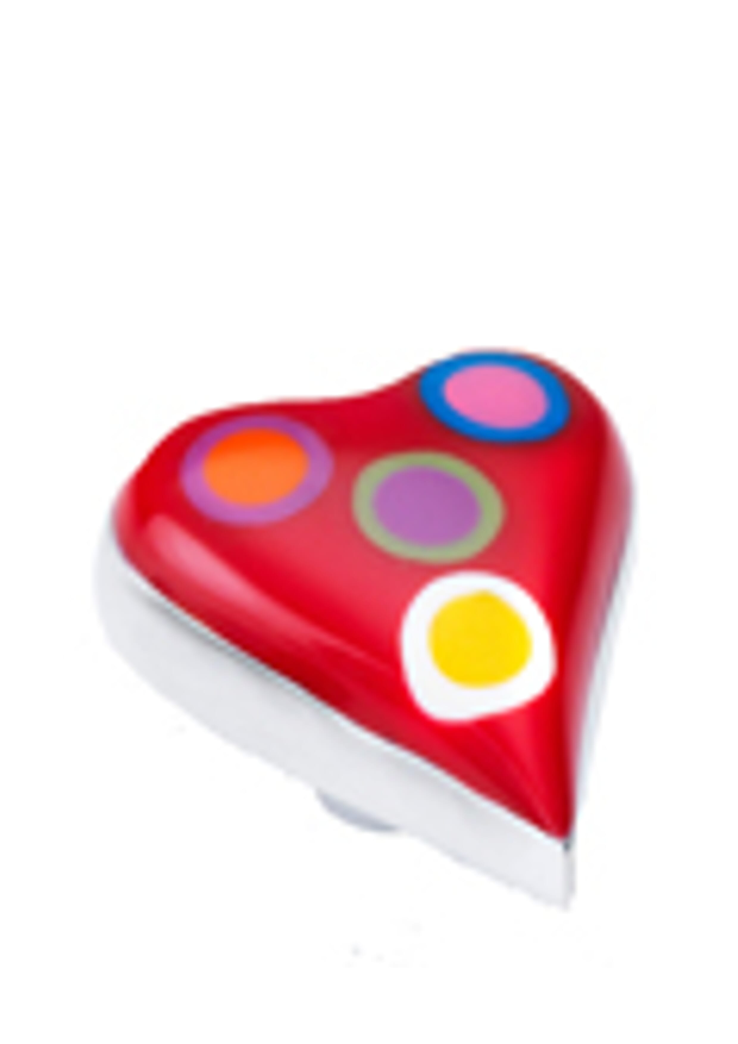Håndlaget, fargerik hjerteknott i aluminium og polyester som passer til innredning som garderobe og skap. Diameter: 42 x 50mm.