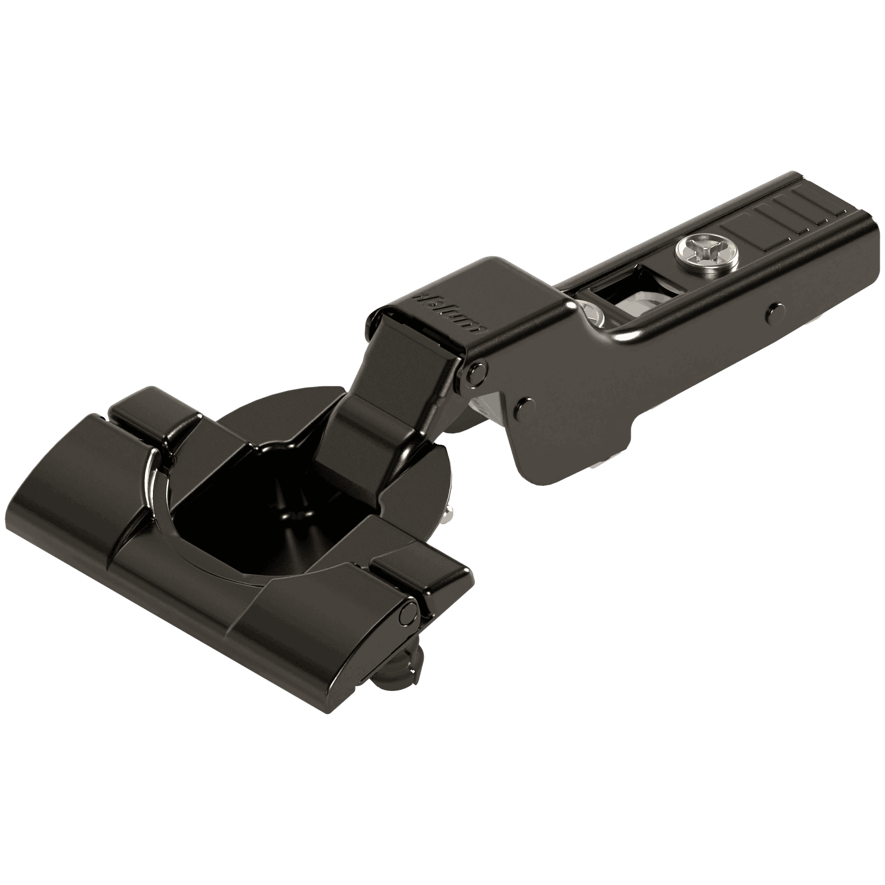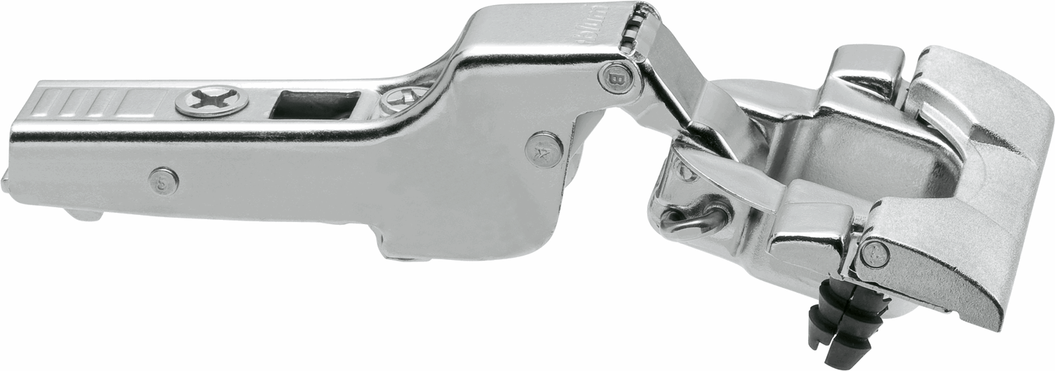 Blum 110 grader halvdekkende hengsel, uten fjær. Hengslet monteres verktøyløst med Inserta.
