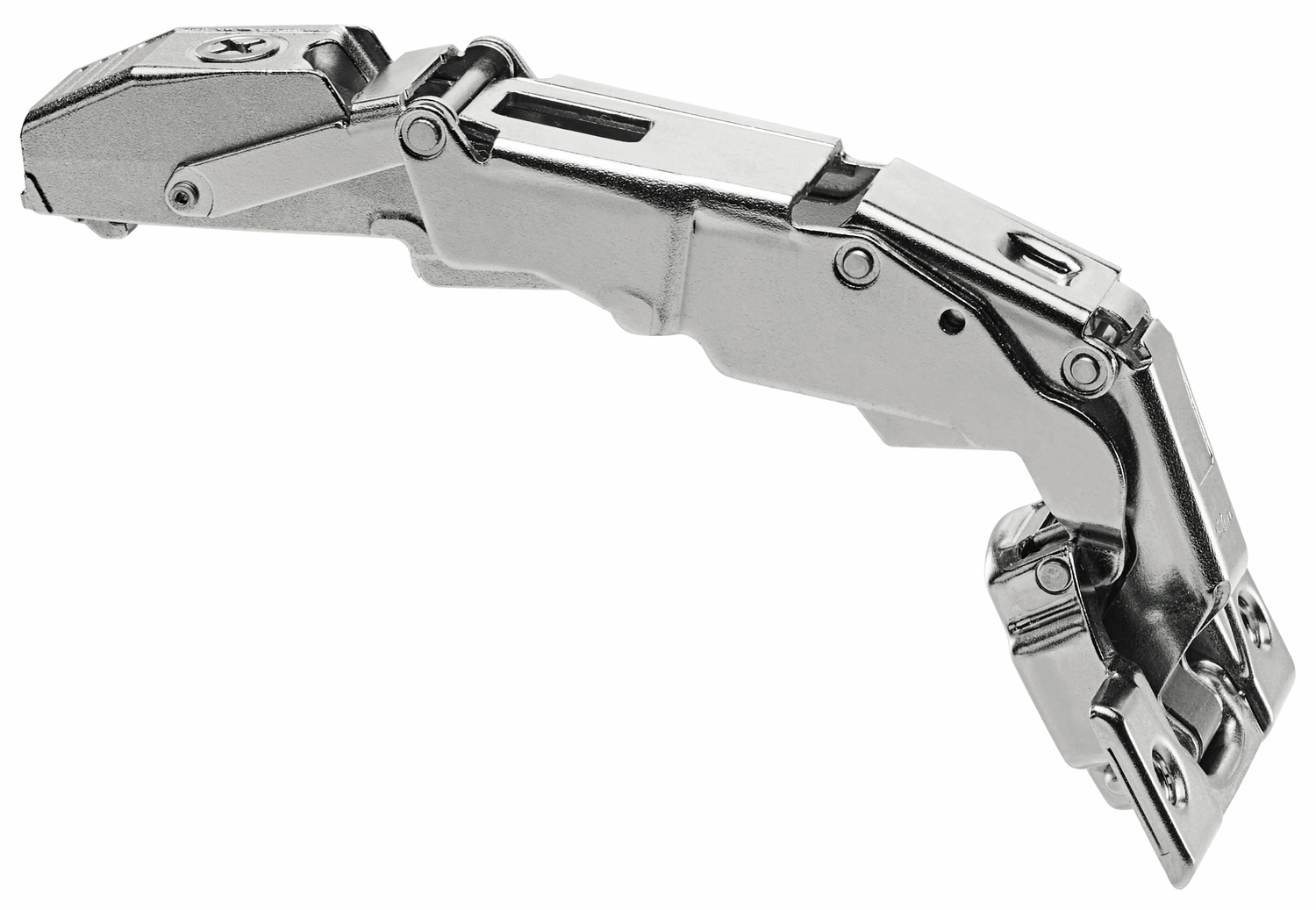 Hengsel med 155° åpningsvinkel, uten sprungmekanisme, med skruemontert boss. For skap uten synlig hengsel, med justerbare posisjoner og glatt bevegelse.