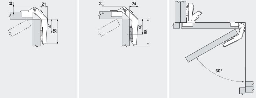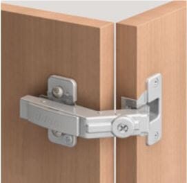 Blum 90/90 hjørneskaphengsel, hengslet monteres med skruer.