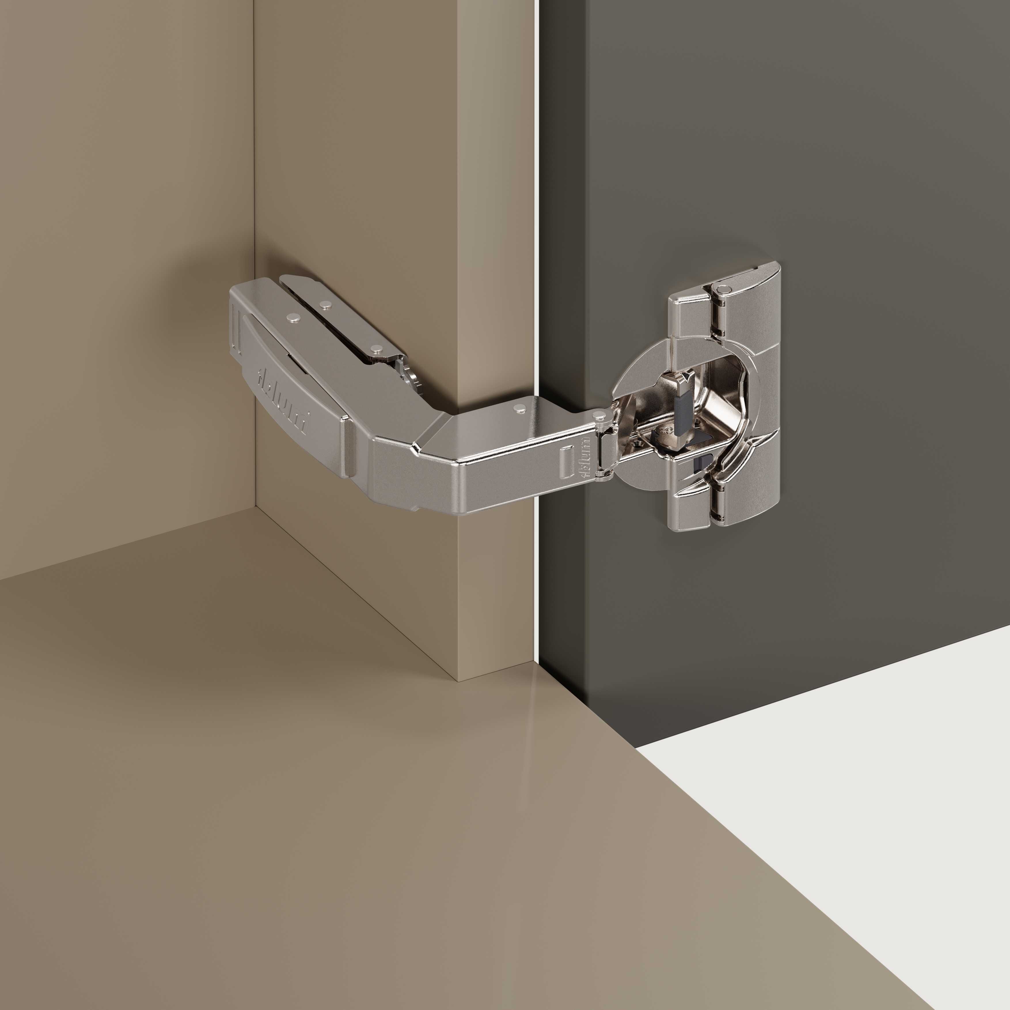 Cliptop demper vinklet hengsel for utenpåliggende med en åpningsvinkel på 110°. Hengselet har en nikkelbelagt stål konstruksjon med inserta.