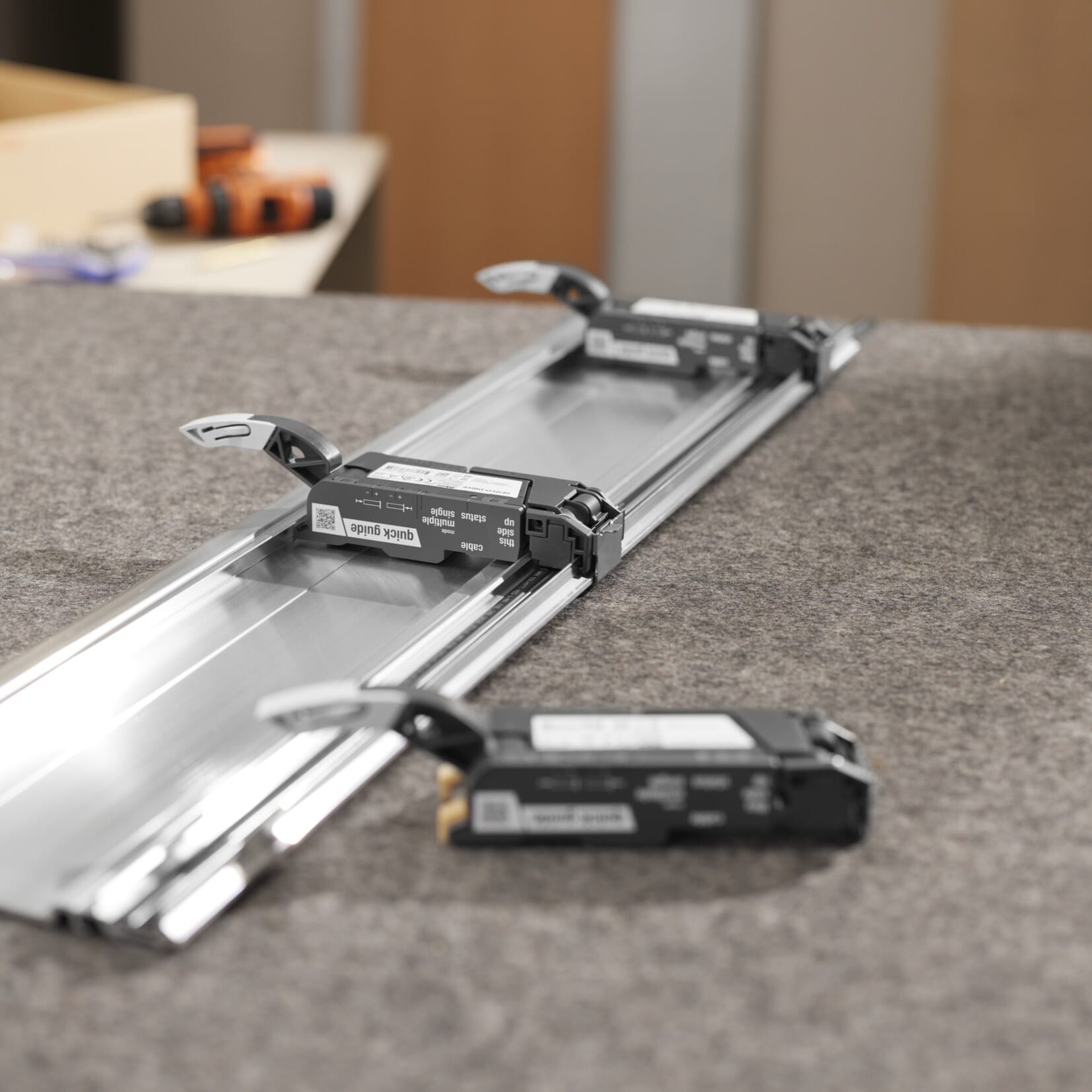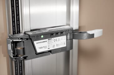 Servo-Drive elektrisk vippenhet fra Blum gir myk, automatisert åpning og lukking for skuffe- og skinnesystemer. Motoren monteres diskret på aluminiumsprofilen i skapets bakkant og aktiveres ved å dytte eller trekke på fronten.