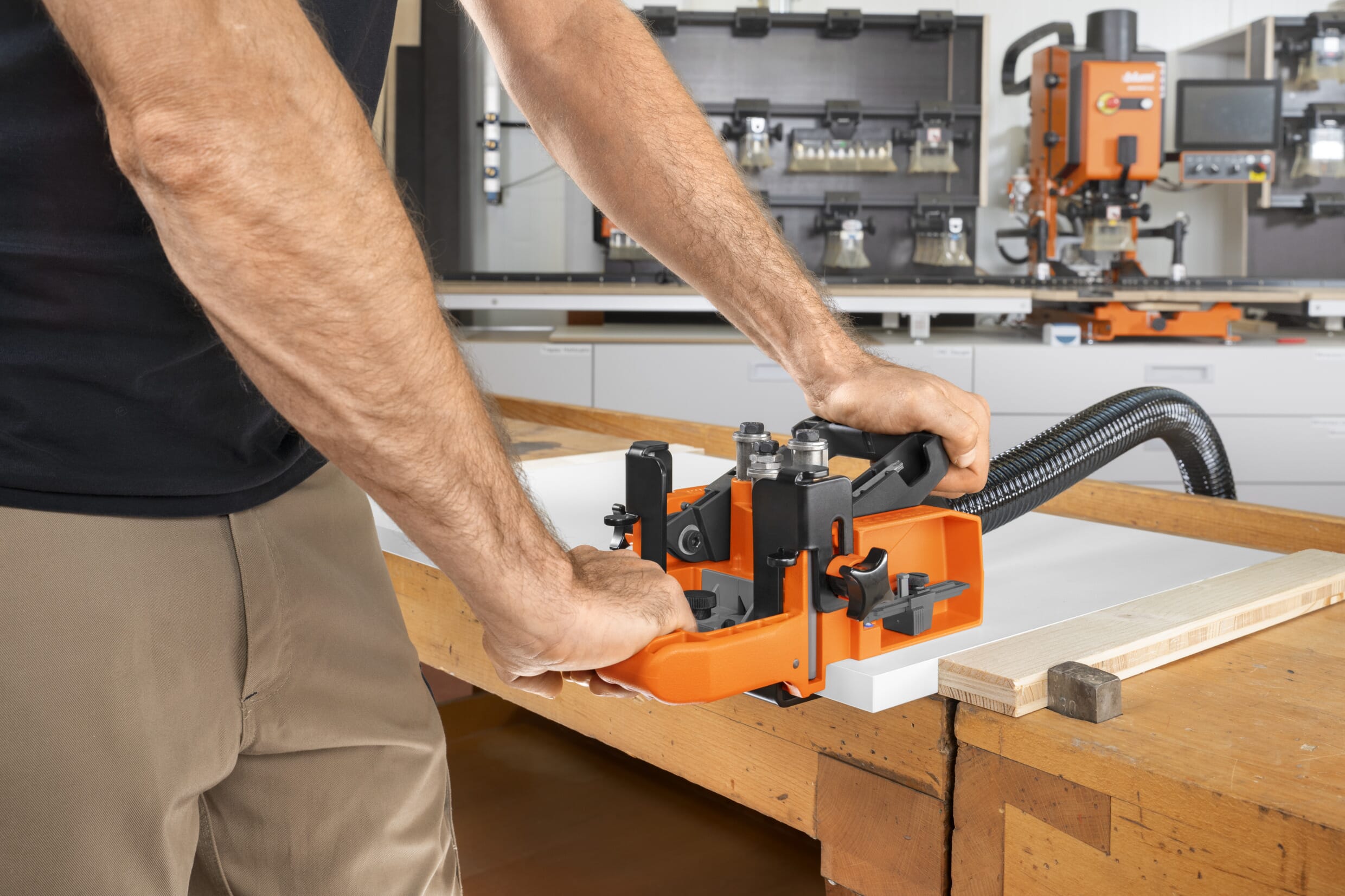 Ecodrill er en borjigg for nøyaktig boring av hullmønsterfor Blum-hengsler, drevet med håndboremaskin for å gjøre montering av hengslerenda enklere.