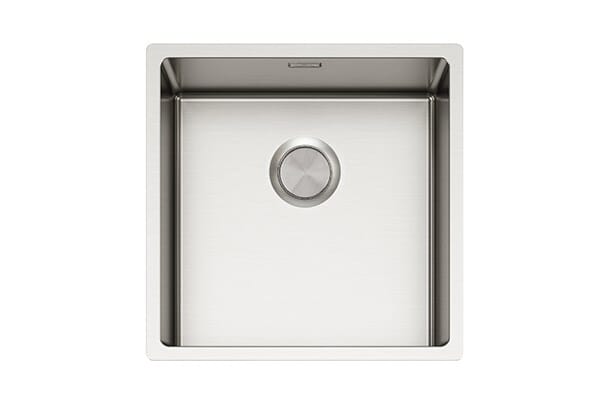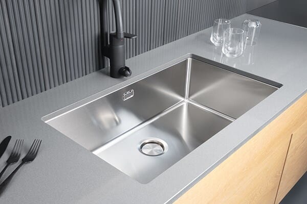 Ultra kjøkkenvasker laget av rustfritt stål med en moderne, minimalistisk design. Vaskene har integrerte overløp og kurvventil, og vannlås med sil og deksel følger med.