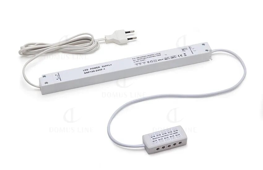 Trafo Led Slim Slt 24V 150W med 10 utganger og 2 meters kabel med stikk. Kompakt strømforsyning for LED-belysning. enkel å installere og brukervennlig.