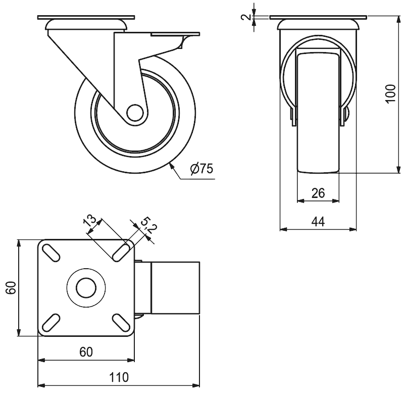Møbelhjul Ø75mm 45 kg