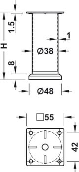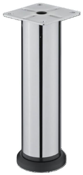 Stabil møbelfot i stål med justerbar høyde opptil +20 mm. Høyde 150 mm. montert med plate for enkel installasjon. Ferdigpolert kromfinish for en stilren og holdbar overflate.