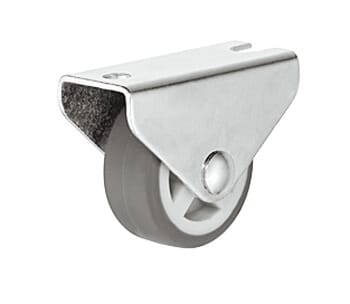 Et fast hjul med myk løpesurface. egnet for sensitive gulv. Diameter 27 mm, installasjonshøyde 34 mm, og maksimal belastning på 20 kg. Monteres med skrufeste. Huset er i galvanisert stål, og hjulet er i plast med grå eller anthracite farge.