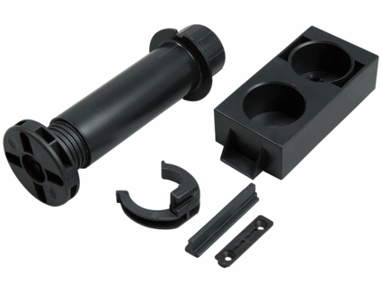 Svart PTFE-Sokkelbein med base. Diameter 50 mm, justerbar høyde 80–125 mm, levert med Ø8 plugger. Klargjort for stabil montering på møbler eller utstyr.