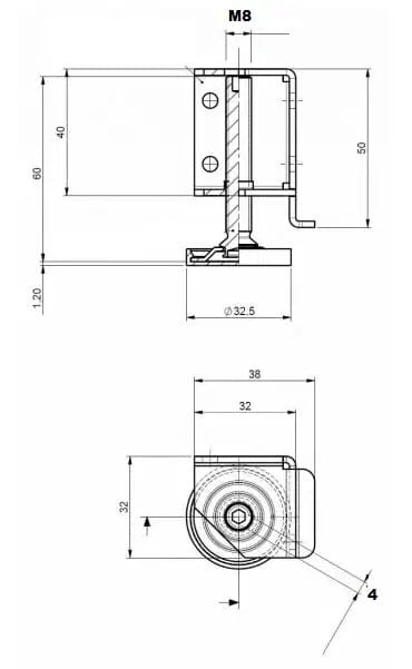 Sterk stålvinkel for sikre, justerbare hjørneløsninger. Med swivel glide, 32,5 mm diameter og M8x60 mm stud med 4 mm hex-hull. Kommer med transparent gulvbeskyttelse for skånsom montering.