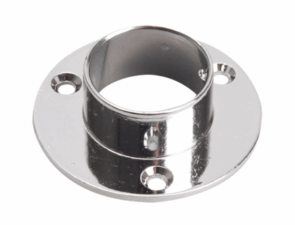En rund bøyerørholder i stål med blank kromoverflate for å feste rør på en sikker måte. Røret har en diameter på 26 mm. og holderen er utstyrt med tre hull på 4,5 mm, samt medfølgende skruer (M4x7) for enkel montering.
