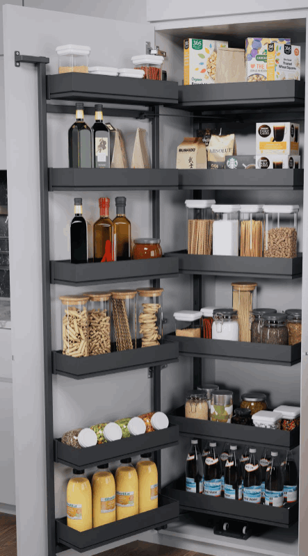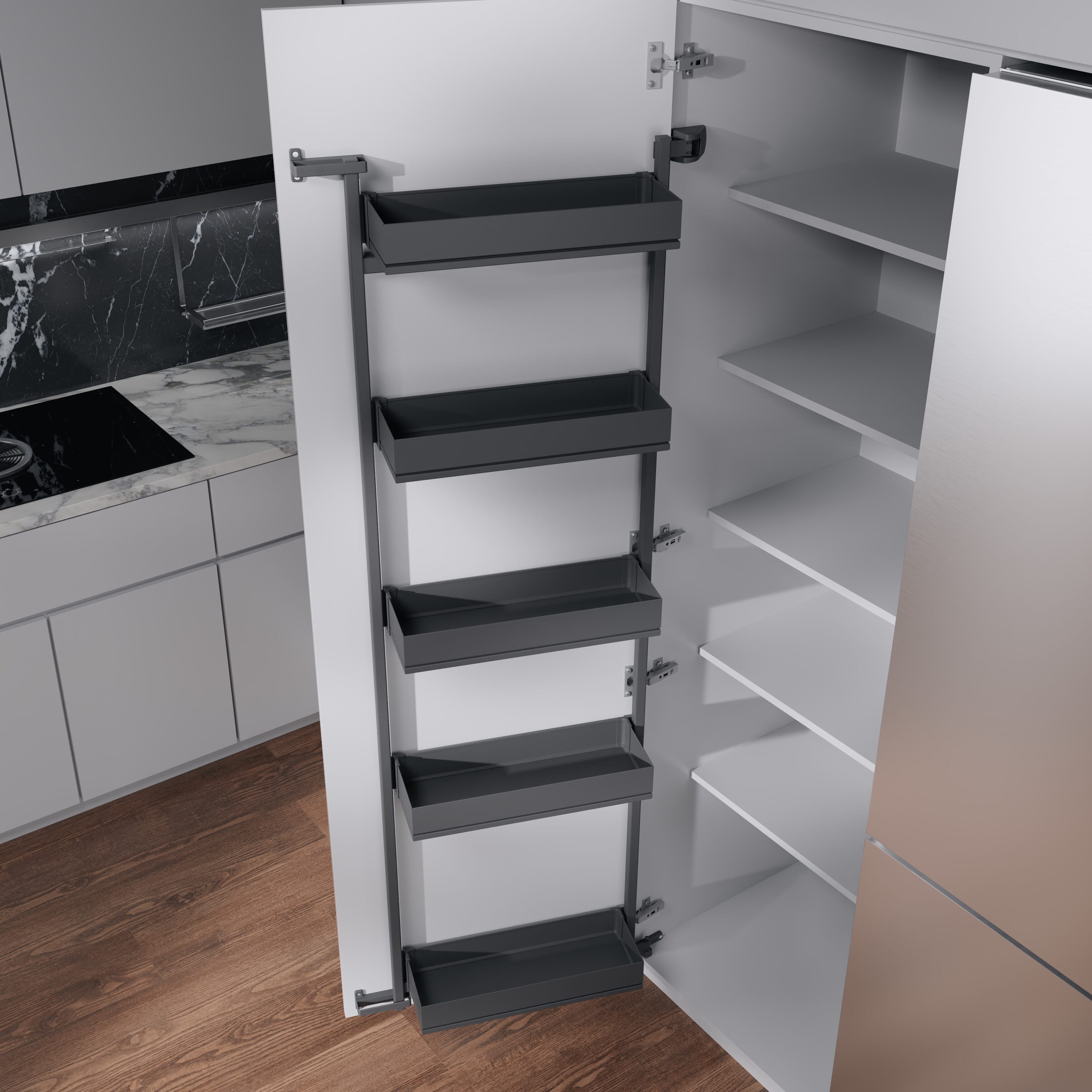 Tandem høyskapsuttrekket til høy dør finnes i størrelse høyde: 1700mm med bredde: 500mm og 600mm i fargen antrasitt. Enkel å feste på innsiden av dørskapet.