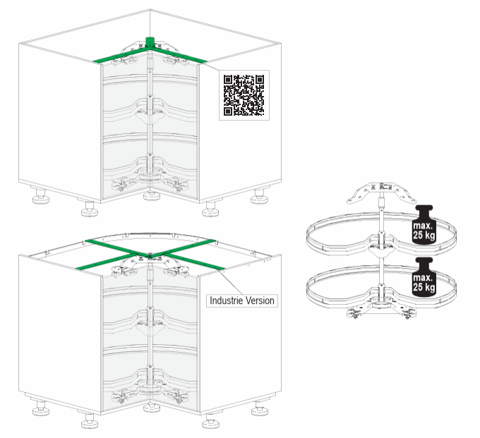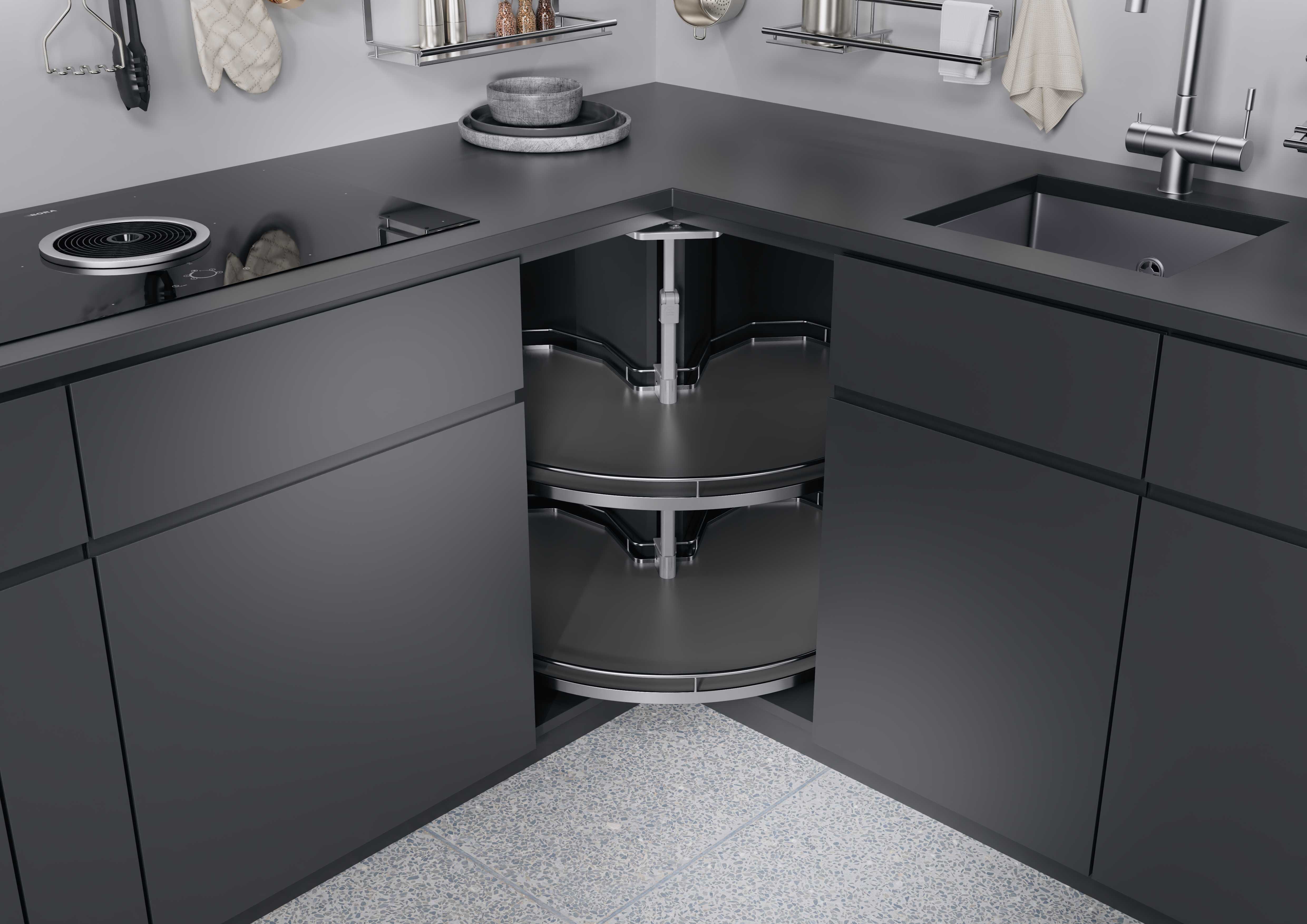 Praktisk. trekvart hjørnekarusell. Finnes i fargen antrasitt. Passer for kjeler, lokk og stekepanner.