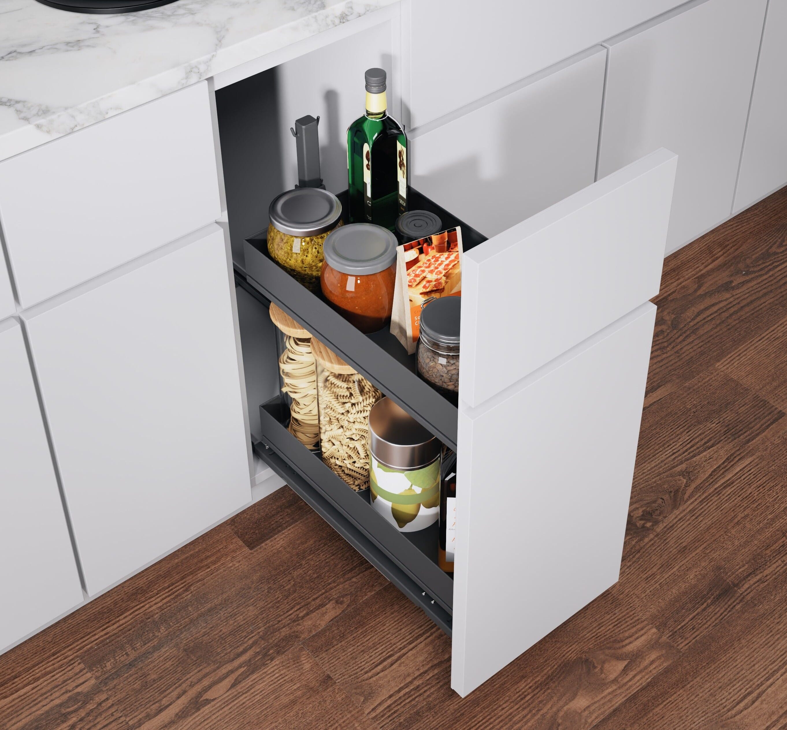 Dette funksjonelle og praktiske benkeskapsuttrekket med fullt uttrekk og demping er til oppbevaring av mat som: frokostblandinger, suppeposer, sauseposer, krukker og glassflasker.