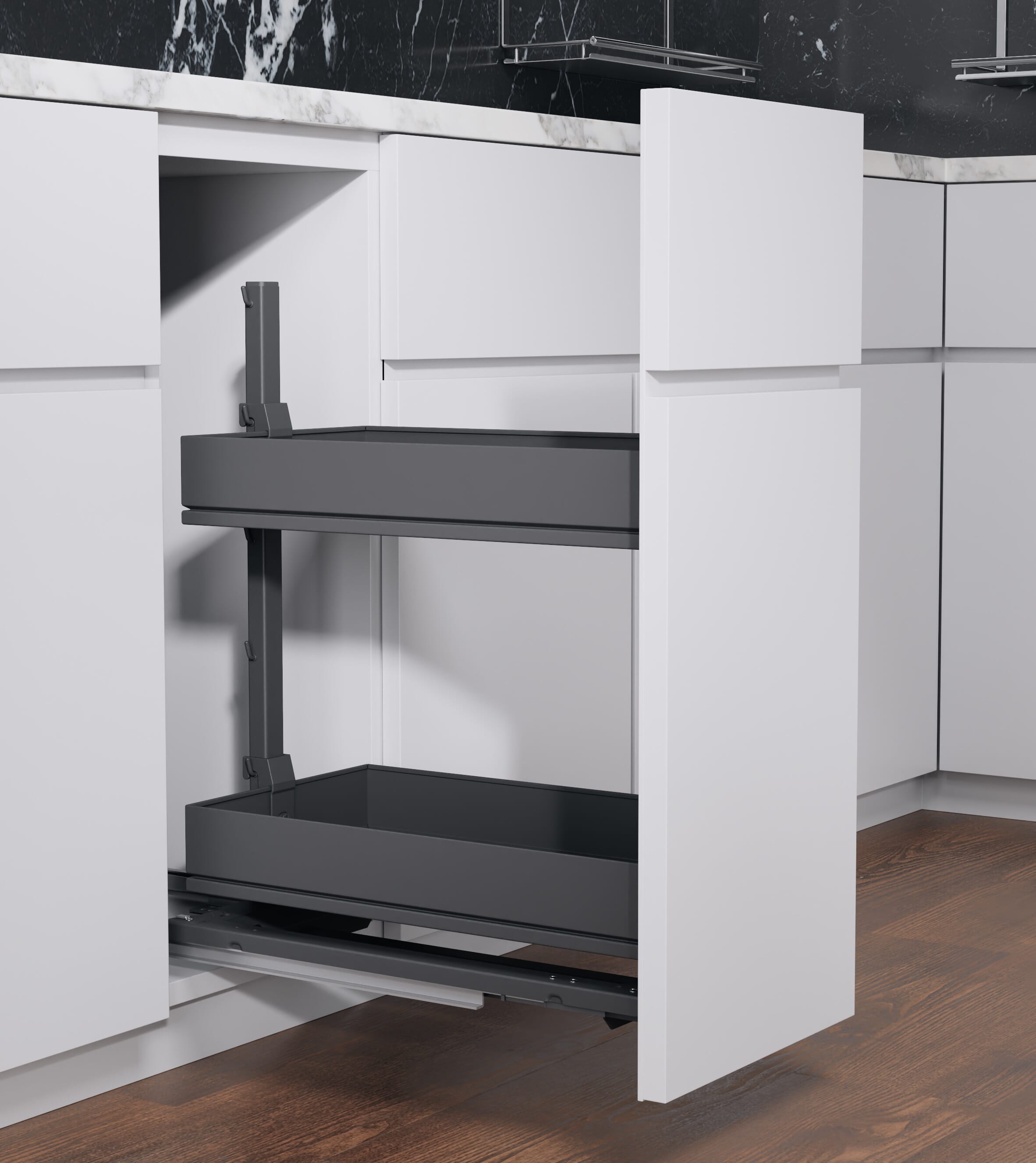 Dette benkeskapsuttrekket finnes i størrelsen bredde: 300/400mm i fargen anstrasitt, og inneholder 2 stk hyller og antisklimatte.