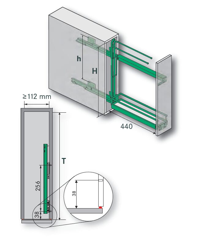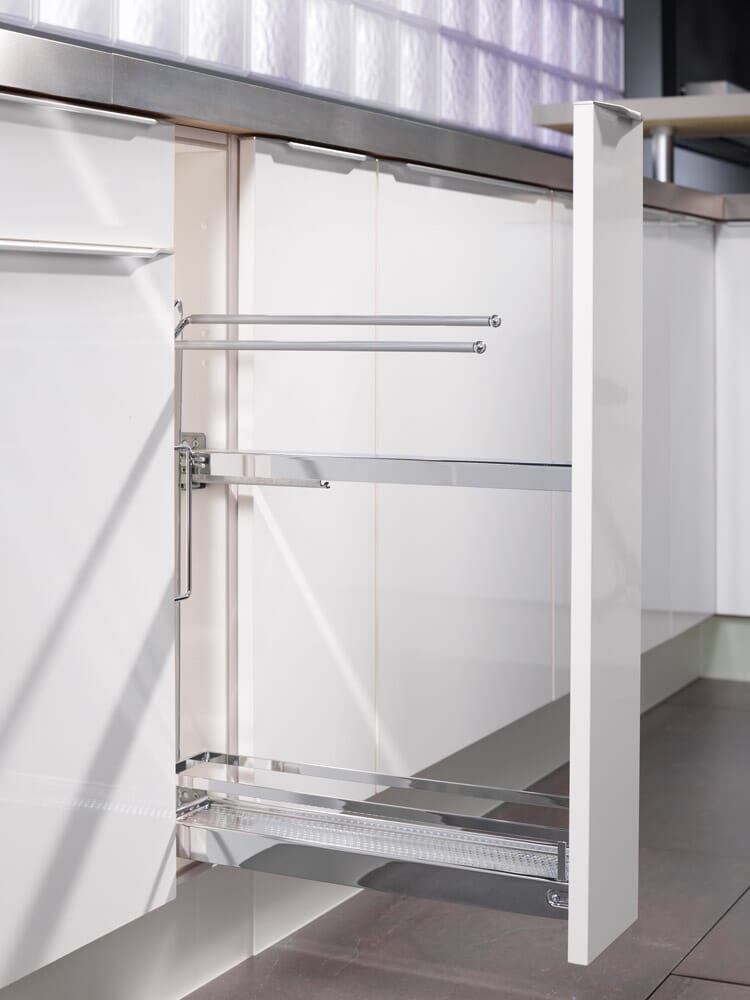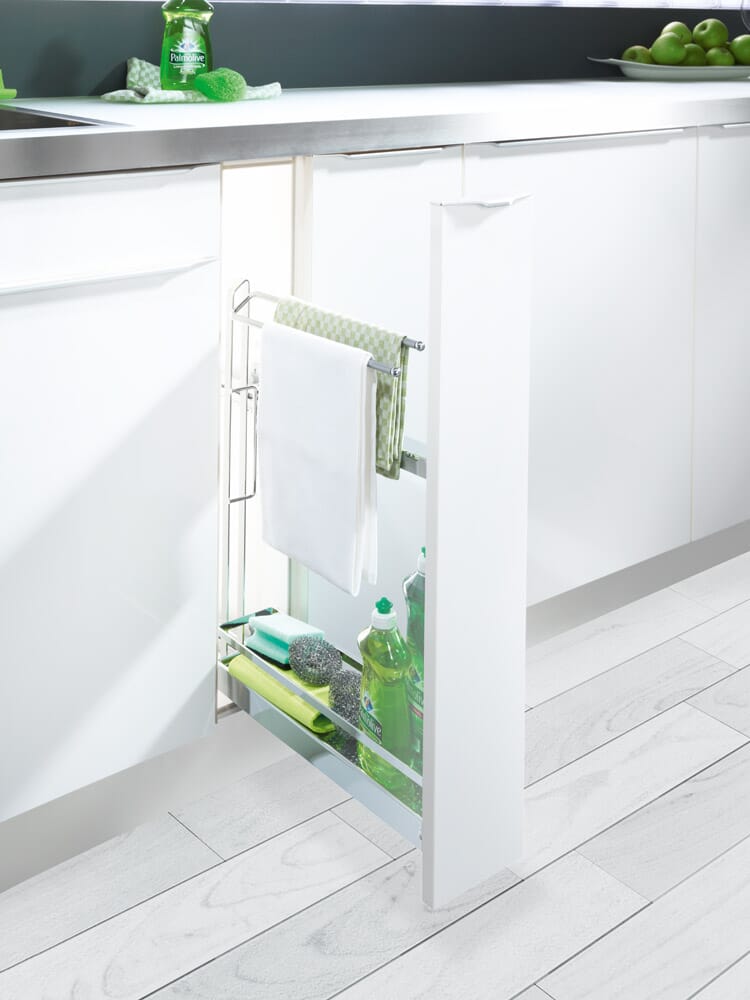Dette funksjonelle og praktiske benkeskapsuttrekket med fullt uttrekk og demping er til oppbevaring av vaskemidler og kjøkkenhåndklær.