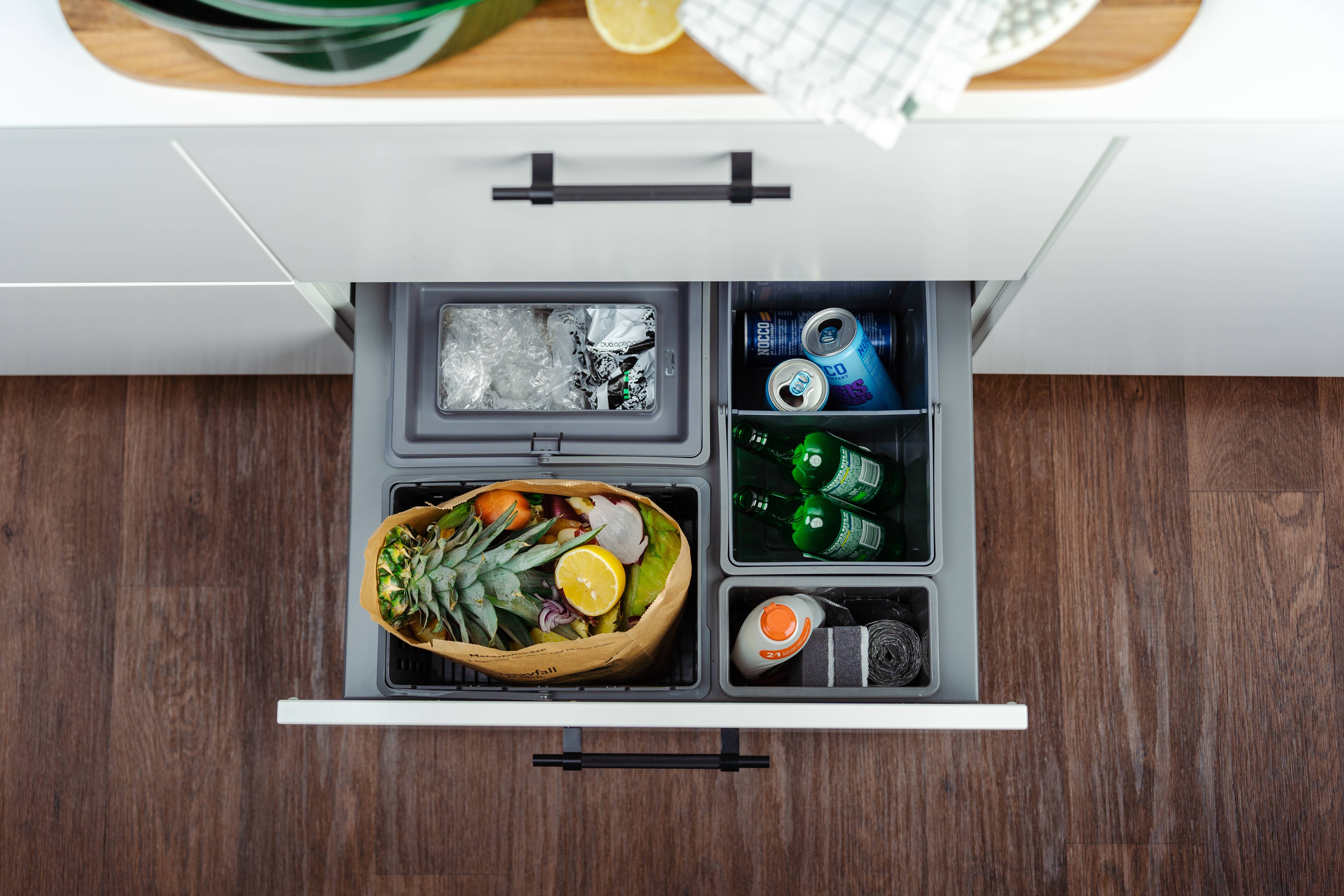 Avfallsortereren for skuffer med en bredde på 600mm og dybde på 450mm. Passer i lave skuffer. skap og ved siden av vasken.