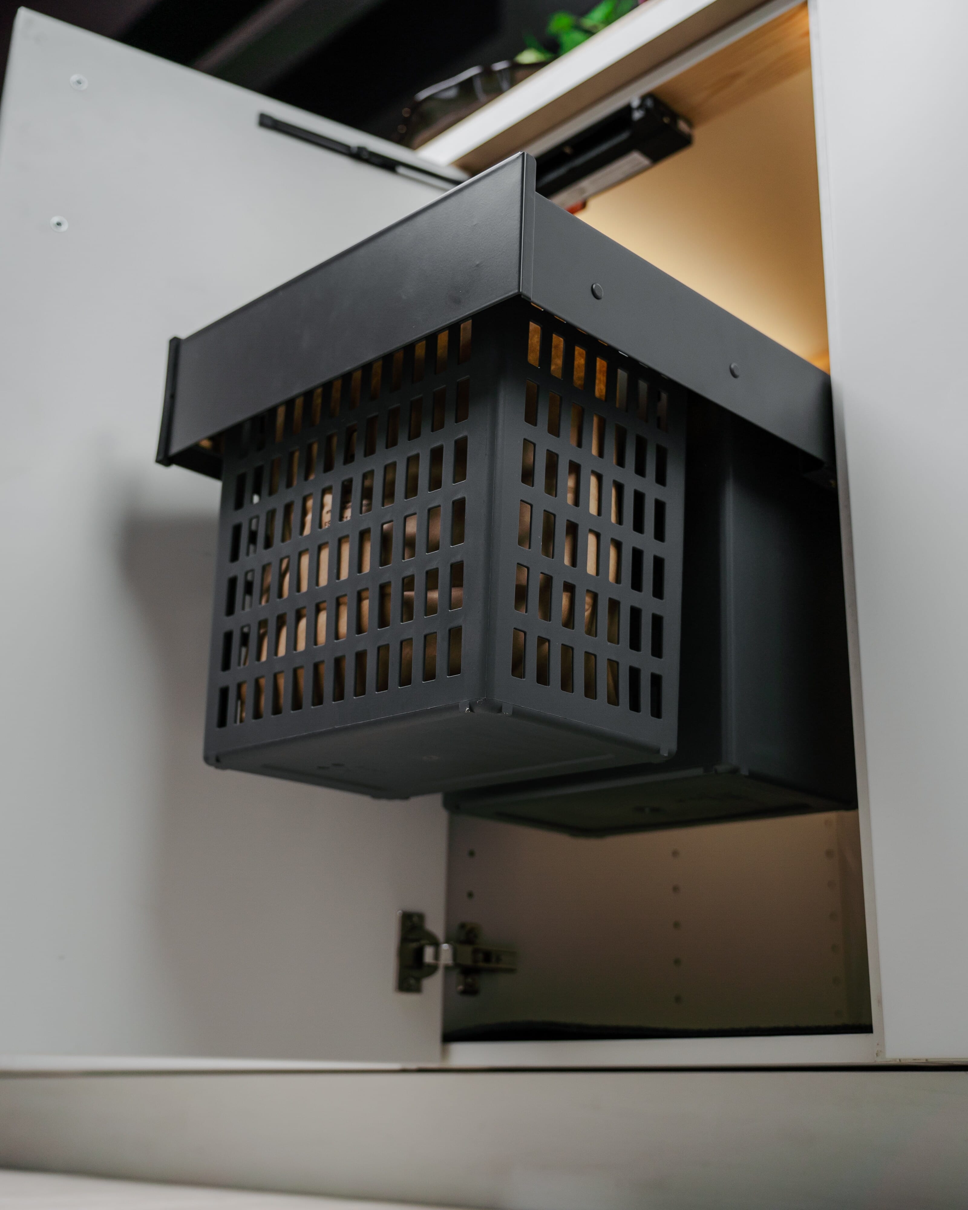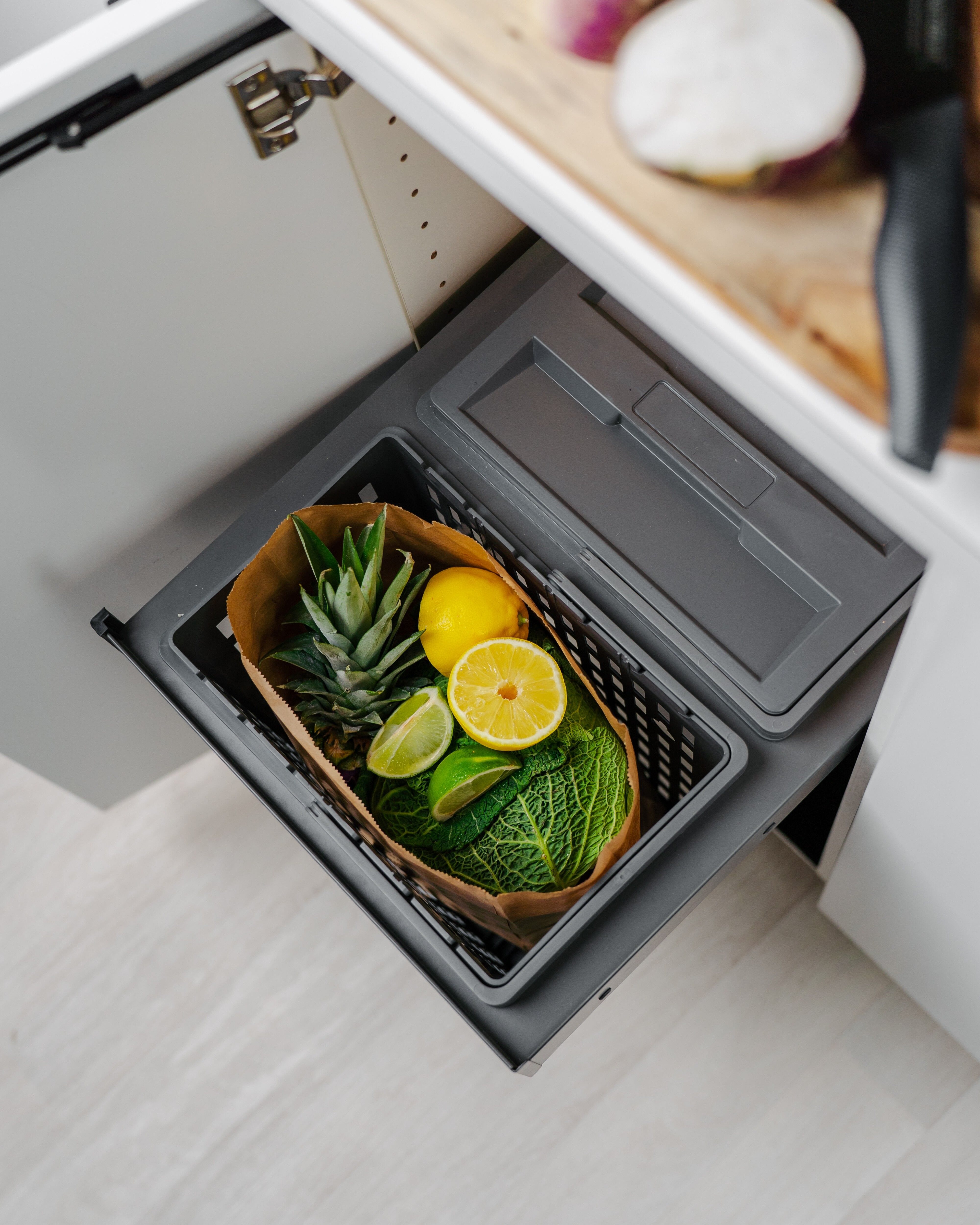 Avfallsorterer for skap med hengslede dører fra 400 mm i bredde. Monteres enkelt på siden og passer både til venstre- og høyrehengslede skap. Den er fullt uttrekkbart. har mykstengende funksjon og tåler tunge laster. Det passer i skap under kjøkkenvask og leveres med den unike matavfallsbeholderen Hero.
