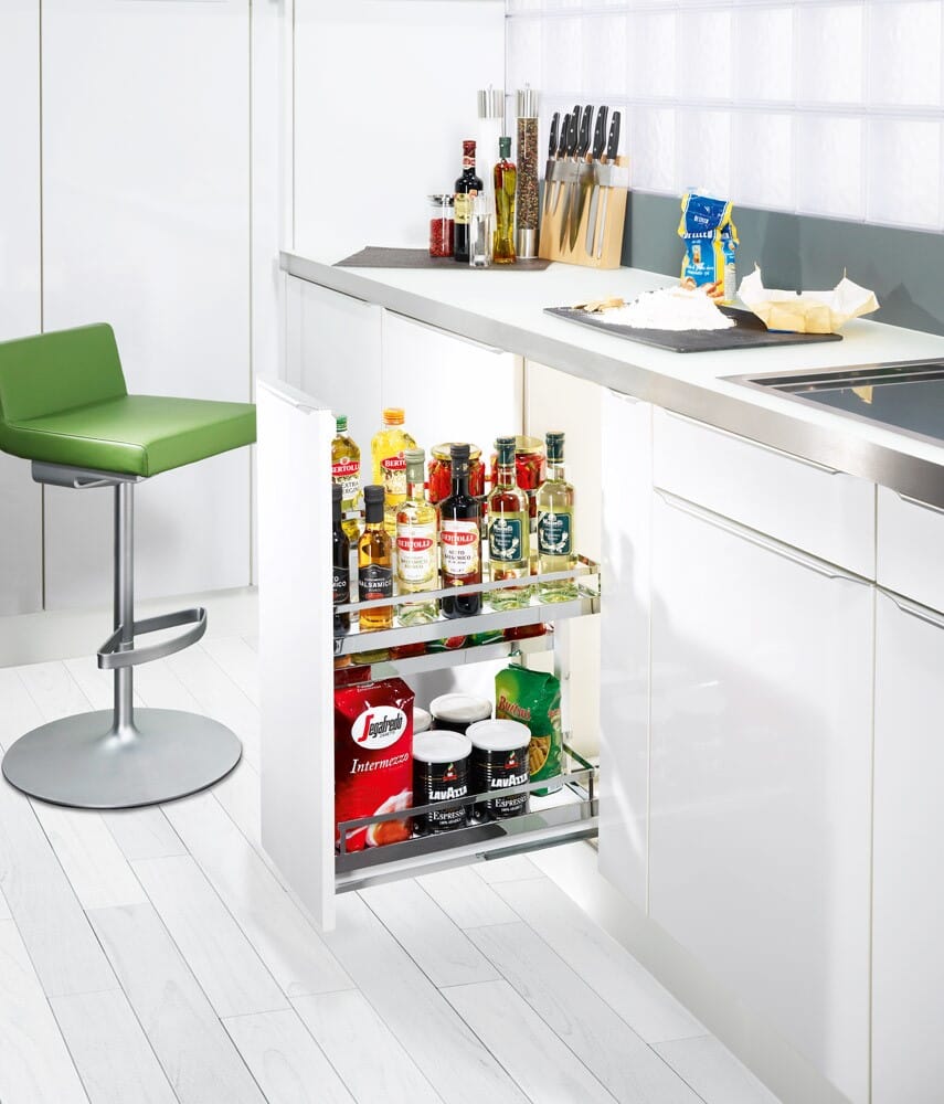 Dette funksjonelle og praktiske benkeskapsuttrekket med fullt uttrekk og demping er til oppbevaring av mat som: frokostblandinger. suppeposer, sauseposer, krukker og glassflasker.
