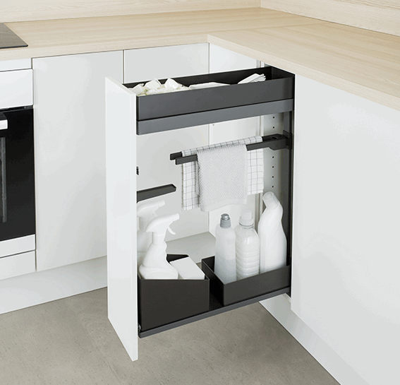 - Praktisk oppbevaring av rengjøringsmidler og kjøkkenhåndklær.