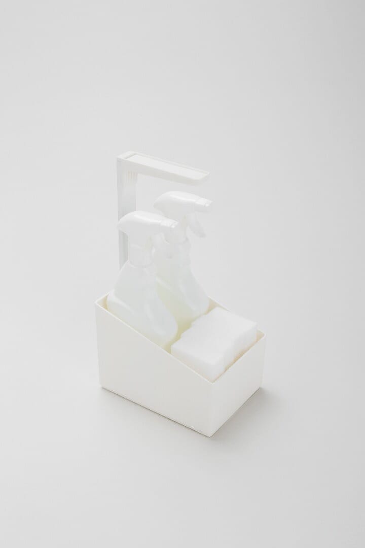 Dette oppbevaringssettet er delt i 2 deler. Øvre del passer for oppvask-børste og oppvasktabletter. Nedre del passer for kjøkkenhåndklær. rengjøringsmidler og oppvaskmidler.