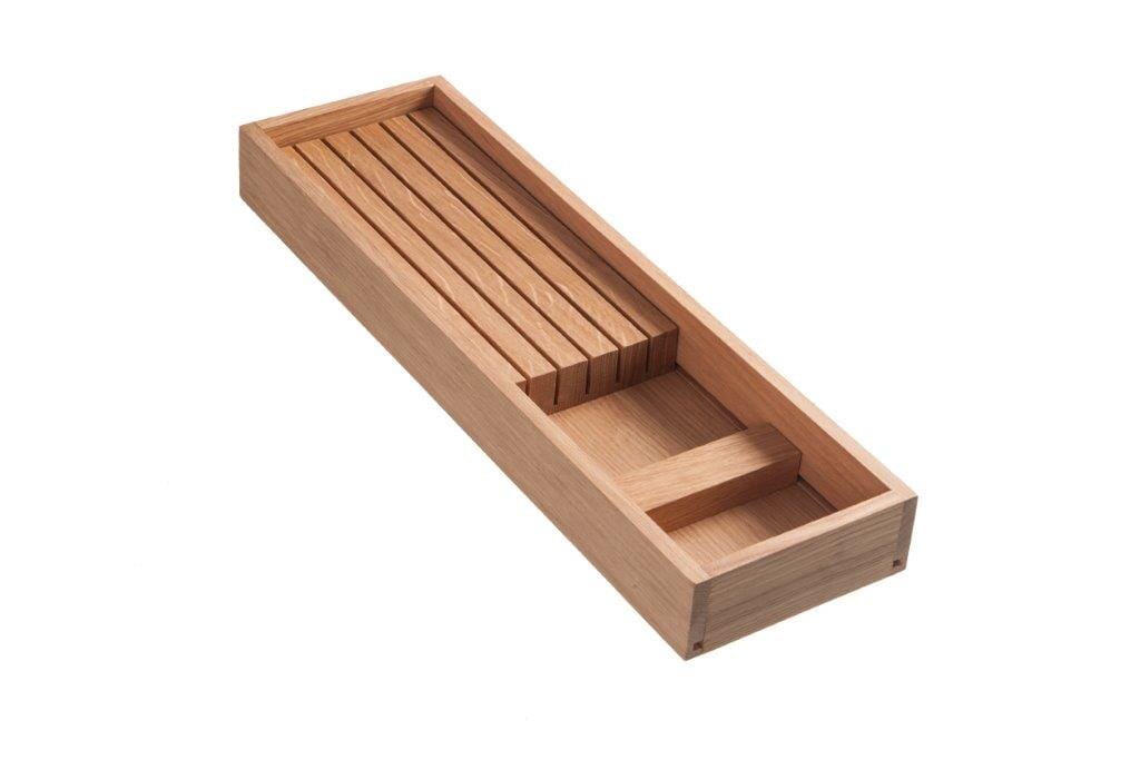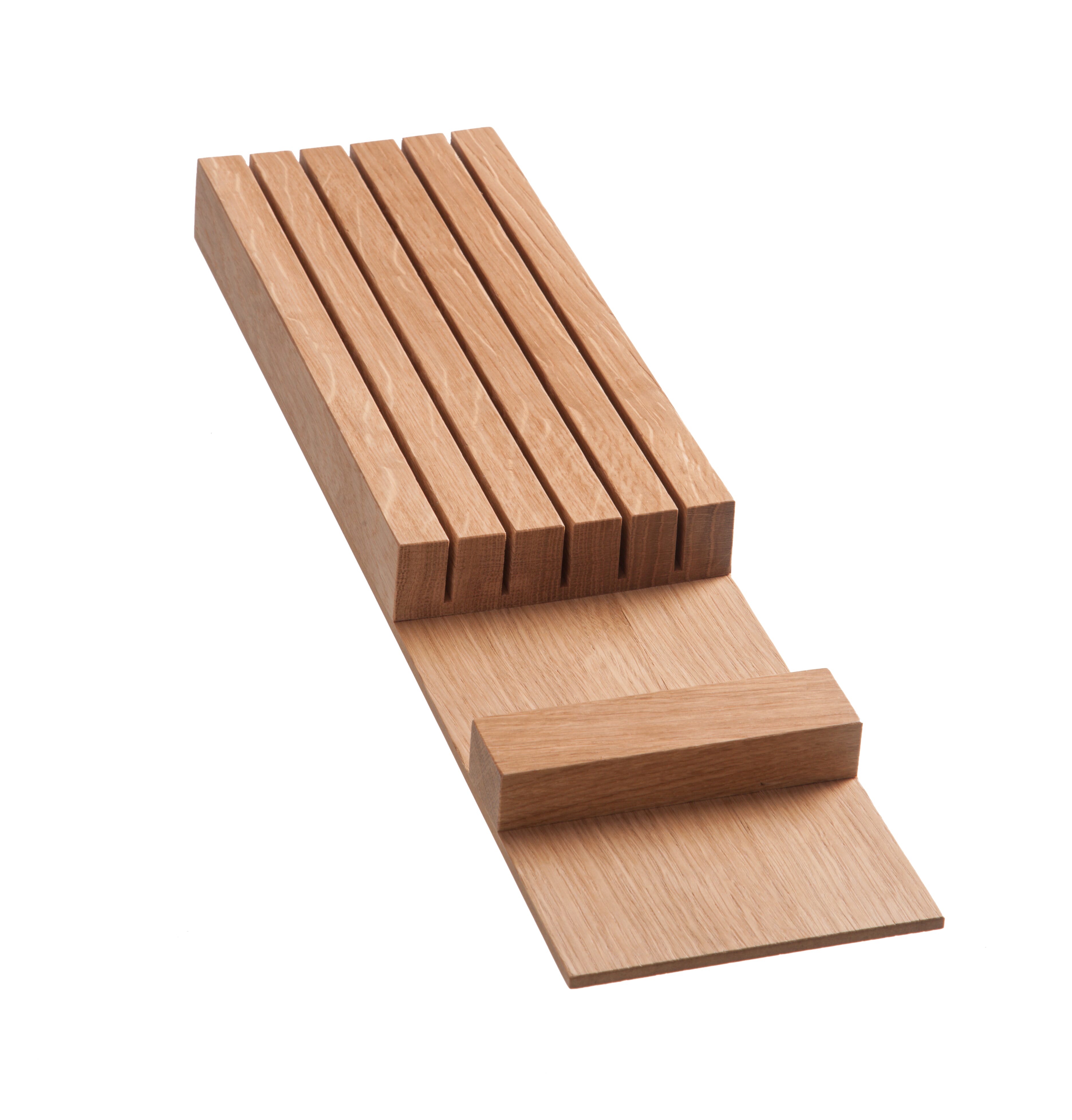 Den praktiske knivblokken passer i kjøkkenskuffen, og bidrar til system, samtidig som den ikke opptar benkeplass. Med knivblokken får knivene en sikker plassering. Modellen er frittstående, og kan kombineres med både bestikkinnlegg, redskapsinnlegg og krydderinnsats i samme serie.