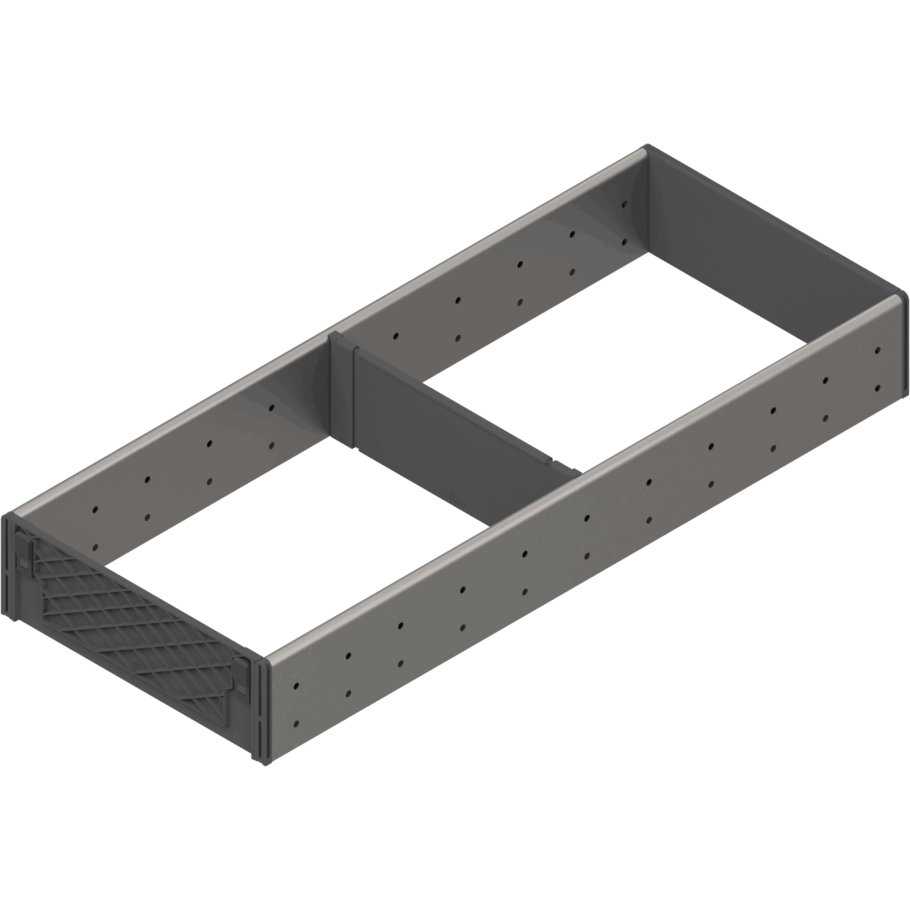 Romdeleren er en oppbevaringsløsning for Tandembox skuffer, designet for å organisere redskaper effektivt. Børstede rustfritt stål i fargen grå.