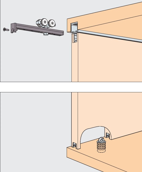 Komplett system for montering av en dør i Hawa Clipo 36 HM IS-serien. Sikrer enkel installasjon og stabil funksjon for enkeltstående skap eller dører.